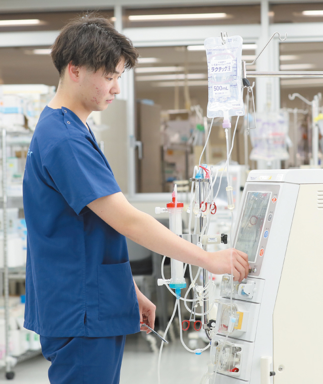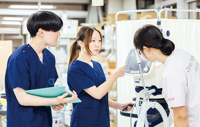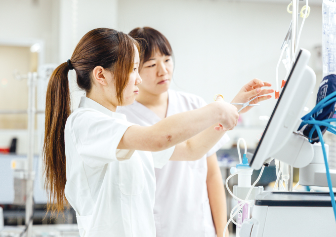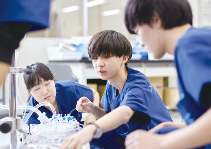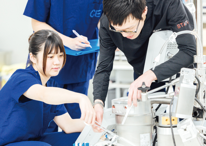 現場で使用される「人工呼吸器」「血液浄化装置」「人工心肺装置」などを用いた実習を行います。高度な医療機器を扱う学習カリキュラムにより、医療現場で活躍できる専門的なスキルを身につけた人材を育成しています。