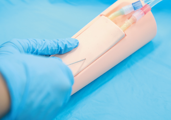 血液浄化(人工透析)装置を使用して、回路の組み立てや血液量の設定をはじめ、注射訓練模型を使用した穿刺や薬剤投与など、人工透析業務に関する一連の技術を身につけます。