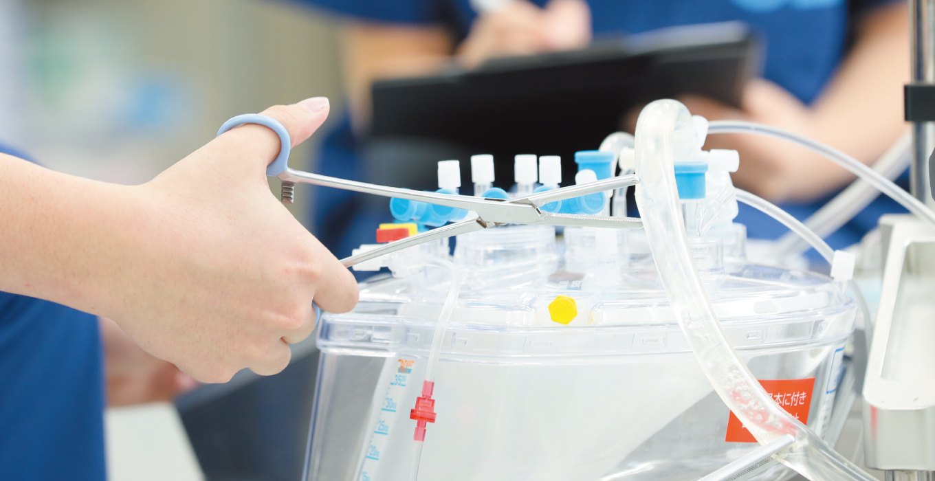 人工心肺装置を使用して、基本操作や保守管理をはじめ、手術状況に応じた投与薬剤の調整など、人工心肺業務に関する一連の技術を身につけます。