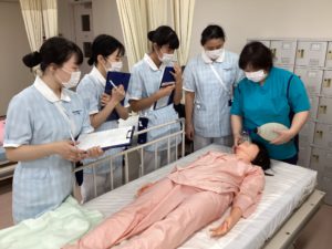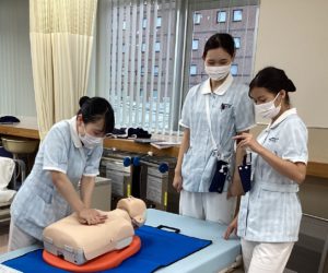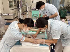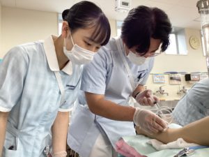 授業では院内における急変を想定して実践し、血管確保のため静脈の走行を確認したり、医療機器の取り扱いを学びました!
