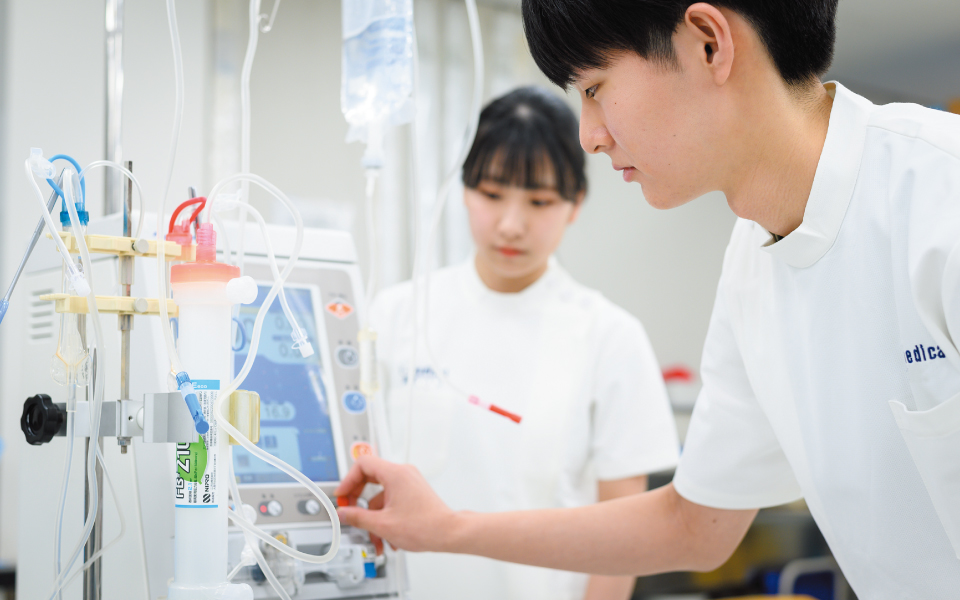 現場で使用される「人工呼吸器」「血液浄化装置」「人工心肺装置」などを用いた実習を行います。高度な医療機器を扱う学習カリキュラムにより、医療現場で活躍できる専門的なスキルを身につけた人材を育成しています。