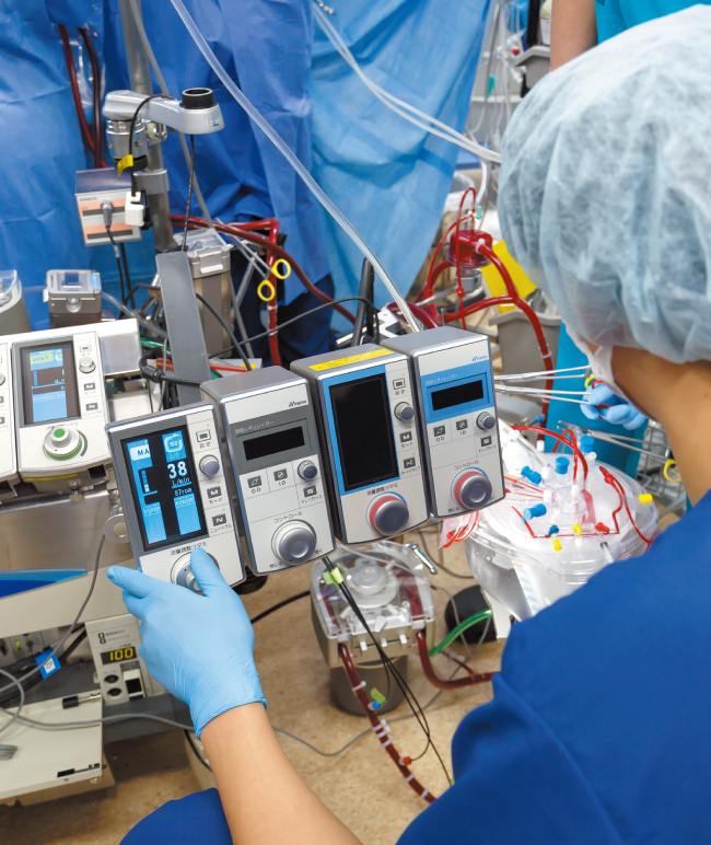 人工心肺装置を使用して、基本操作や保守管理をはじめ、手術状況に応じた投与薬剤の調整など、人工心肺業務に関する一連の技術を身につけます。